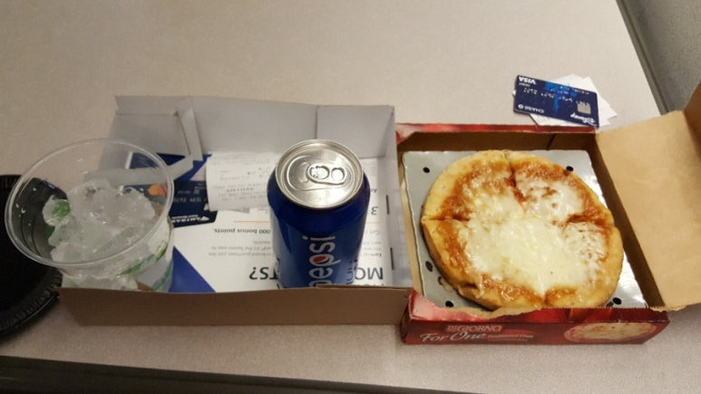 여튼 나는 비록 시간이 부족해 먹지 못했던 시카고 피자의 한을 풀고자 피자와 펩시콜라를 주문해 먹었다. 냉동피자였는데 진심 위에 발려진 소스가 된장인지 토마토소스인지 모를만큼 꾸린내가 났다. 빵도 부드럽고 치즈도 괜찮았으나 재료의 빈약함과 냄새때문에 맛 평가를 절하시킬 수 밖에 없었다.