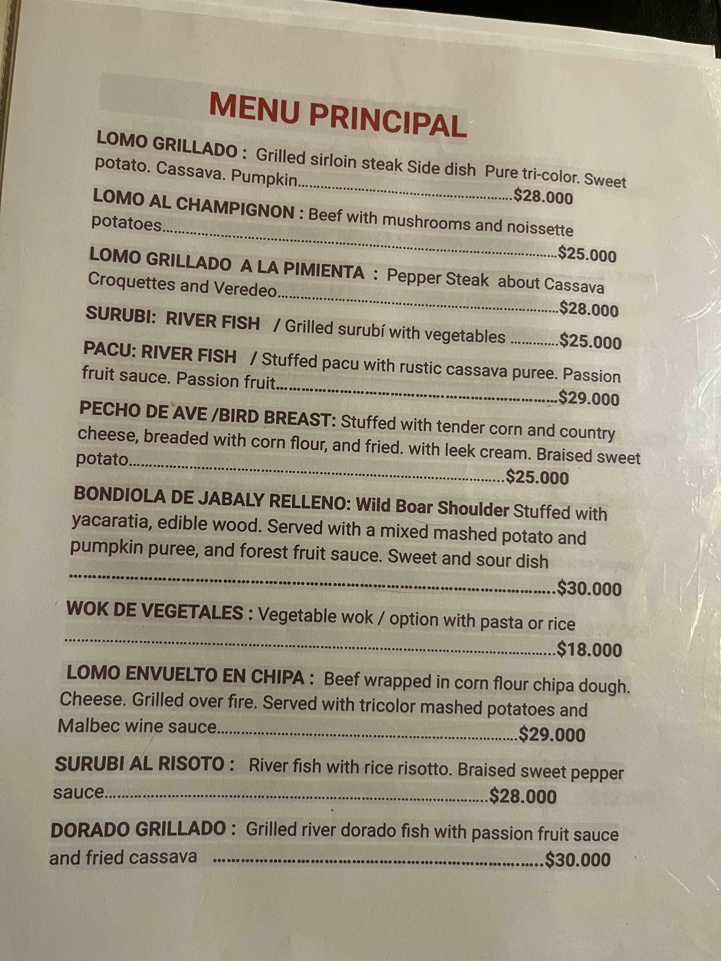 의 음식이 있다. 그러니 아무리 스페인어를 모르더라도 Parrilla 밑에 있는 메뉴 아무거나 고르면 단백질은 채울 수 있다는 점이다. 우리는 이곳에서 쵸리소 소고기 스테이크와 야생 맷돼지 고기 스테이크를 주문했다.