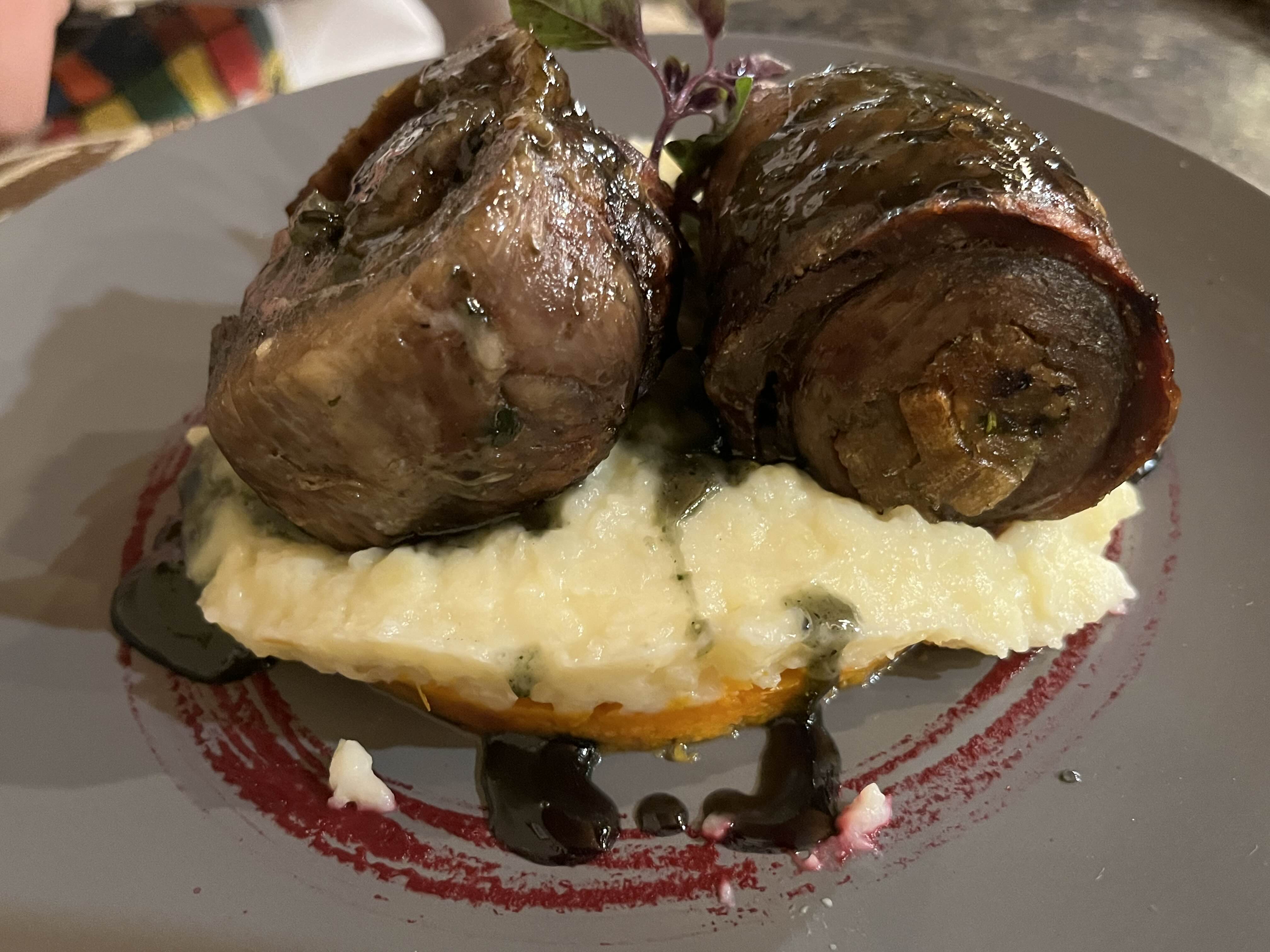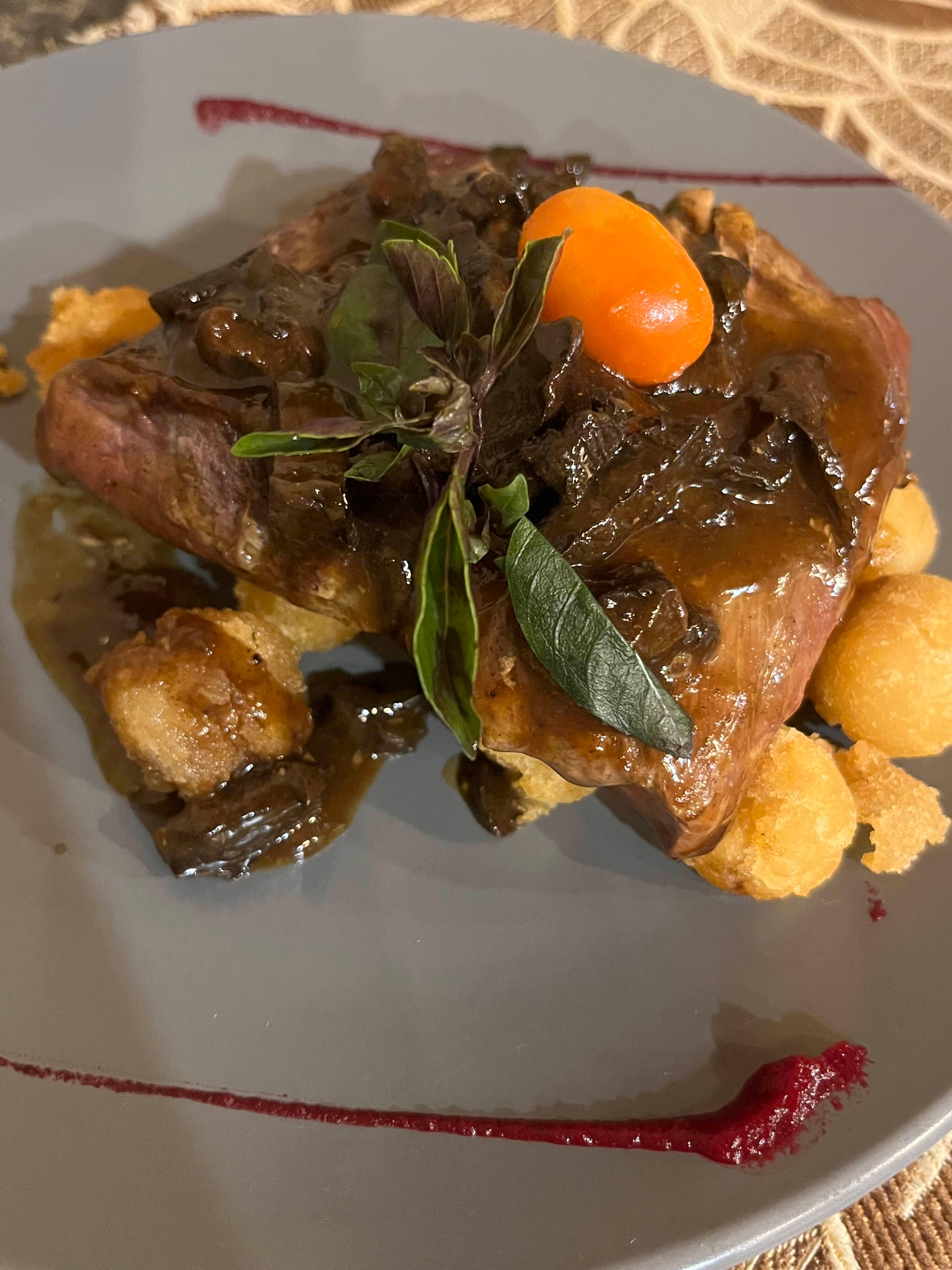 친구가 주문한 야생 맷돼지 고기 스테이크. 한입 먹어 봤는데 생각보다 많이 질기고 이 메뉴 또한 매우 건조함. 그릇의 데코레이션은 이 메뉴 또한 예술적인 편이였다.